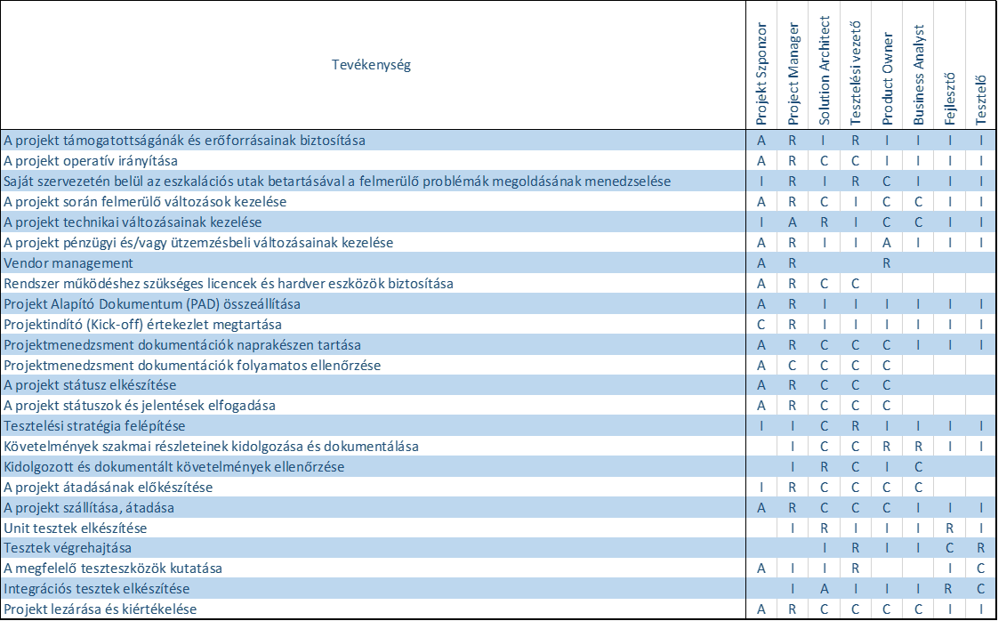 Az egyes szerepekhez tartozó feladatok és felelősségek az 1.sz mellékletben található felelősség-hozzárendelési (RACI) mátrix-ban kerülnek részletes kifejtésre.