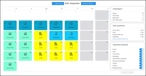 - Teljeskörű home office és szabadságigénylés, valamint az igények kezelése (jóváhagyás/elutasítás)